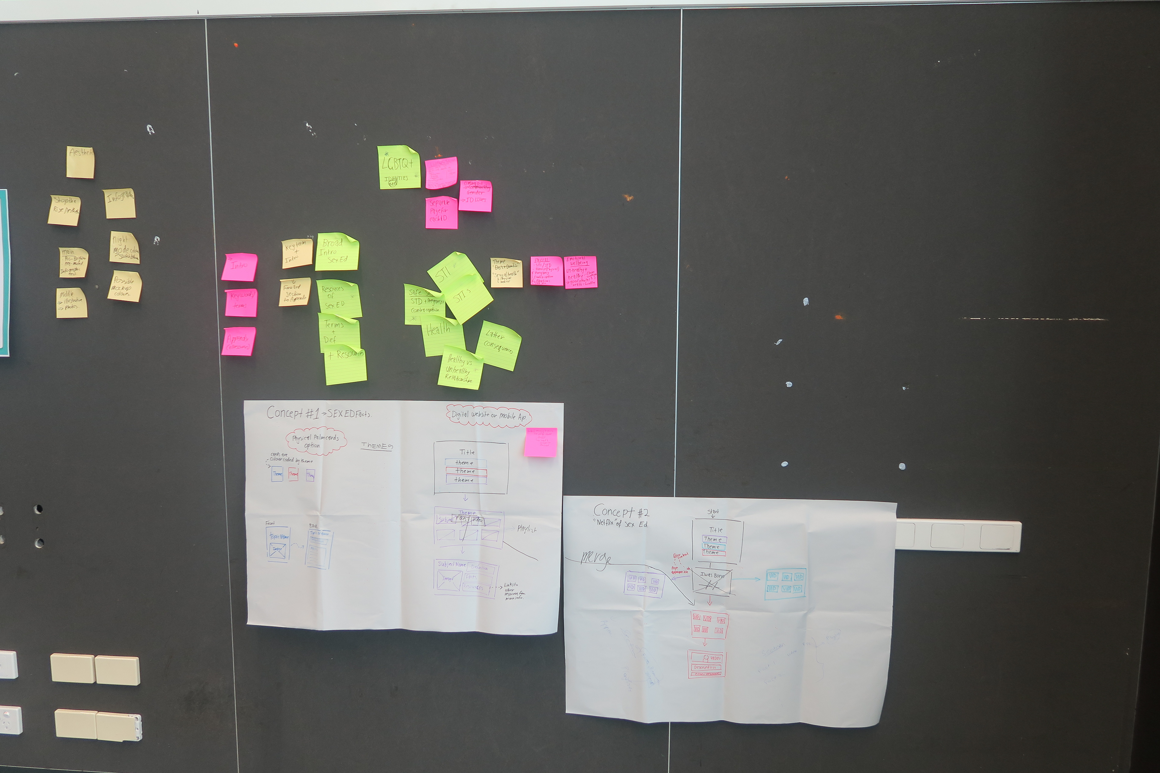 Images from Workshop One, identify key themes of effective/ ineffective sexual health educational resources, participants' experiences regarding educational resources, and defining the term sexual health. From data collected from Workshop One, three initial educational concepts (below) were created.